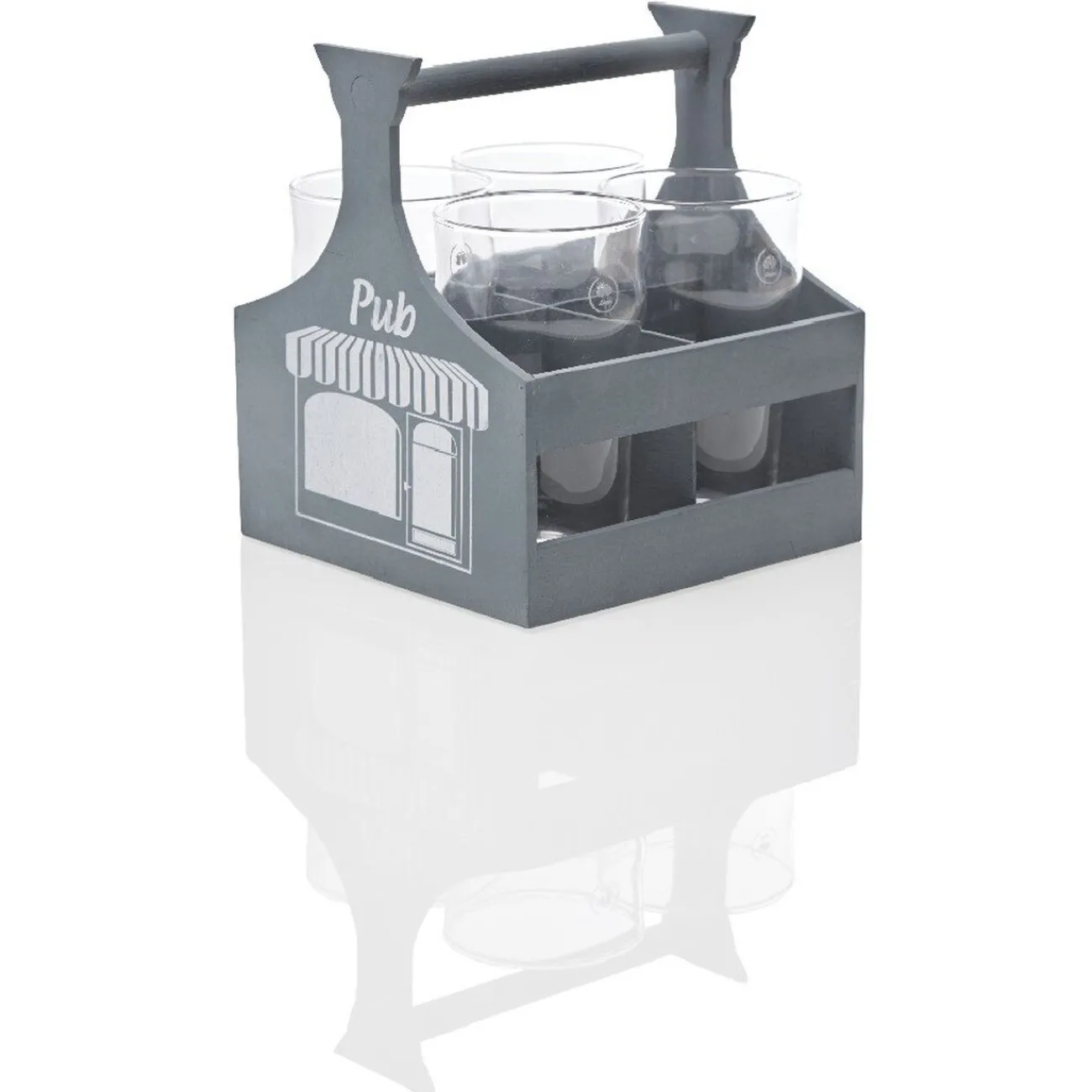 Lot de 4 verres à bière transparents avec leur support en bois gris.