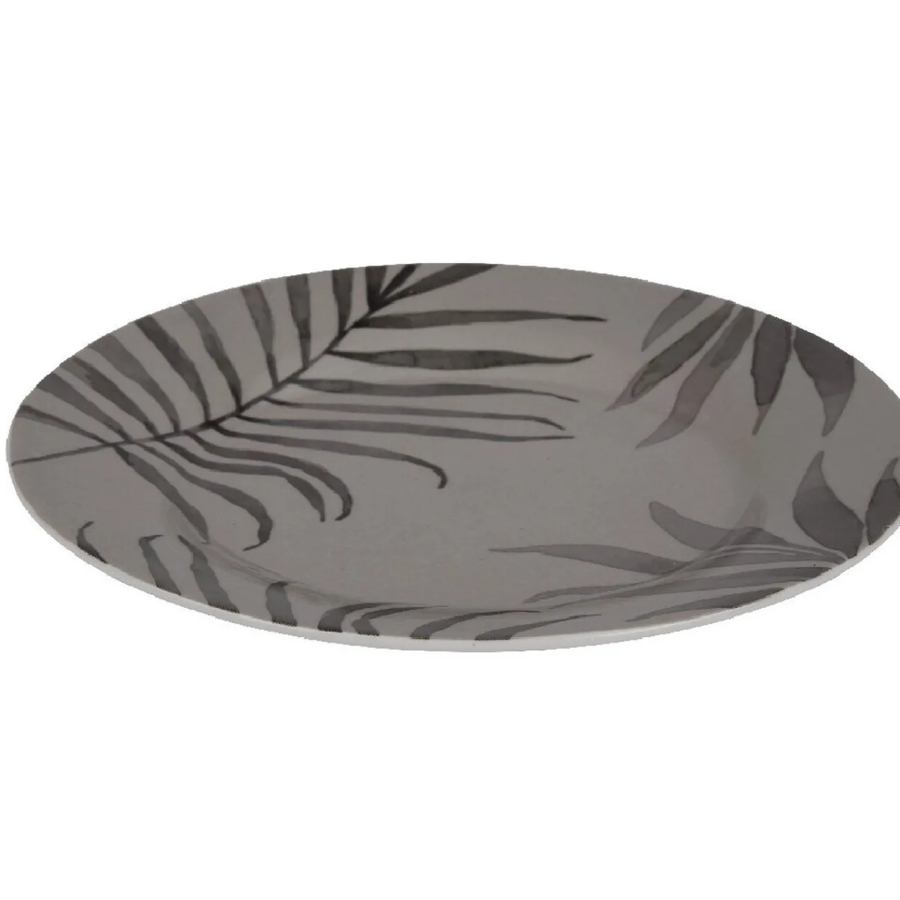 Assiette à dessert ronde en porcelaine de couleur taupe imprimée de feuilles de palmier.