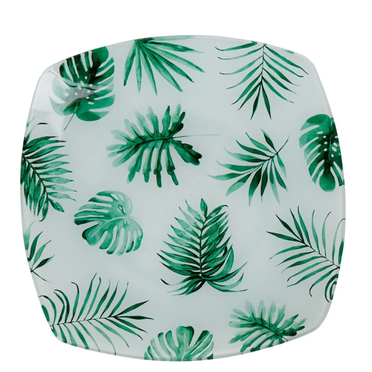 Succombez à la tendance déco tropicale avec cette assiette carrée blanche agrémentée d’un motif végétal vert.