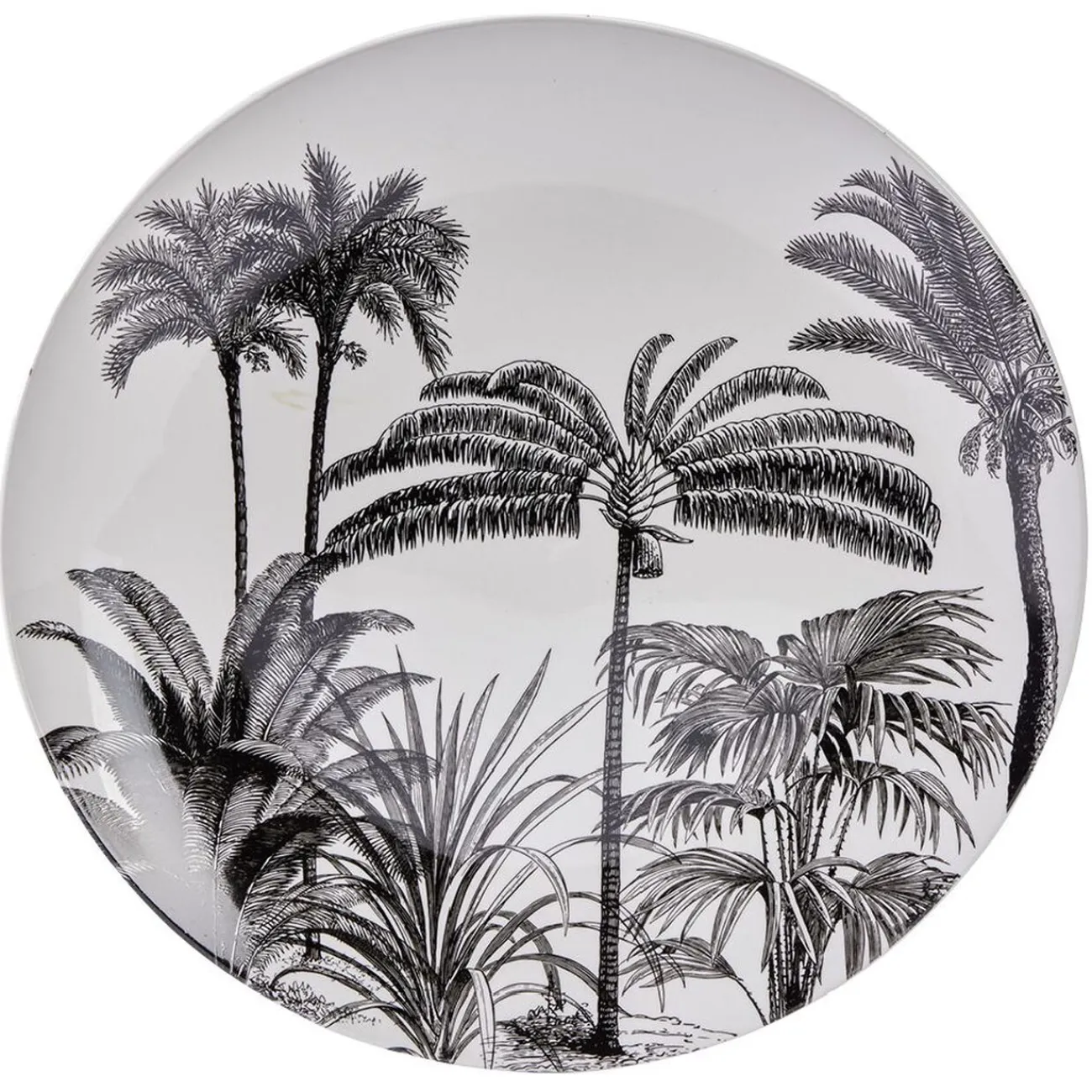 Assiette plate en porcelaine à motif végétal exotique. Existe en 2 décors assortis, modèle disponible selon stock en magasin.
