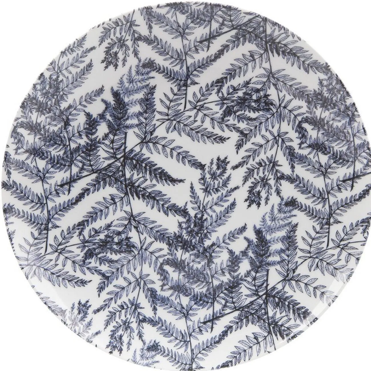 Dressez votre table avec une touche raffinée grâce à cette assiette plate blanche décorée de motifs feuillages bleus.