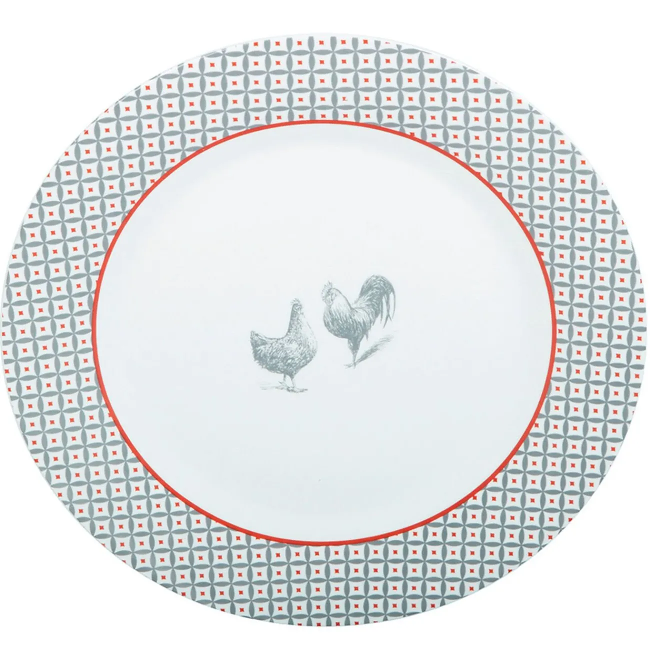 Assiette plate ronde design poule et rebord motifs triangulaire de couleur blanche, grise et rouge.