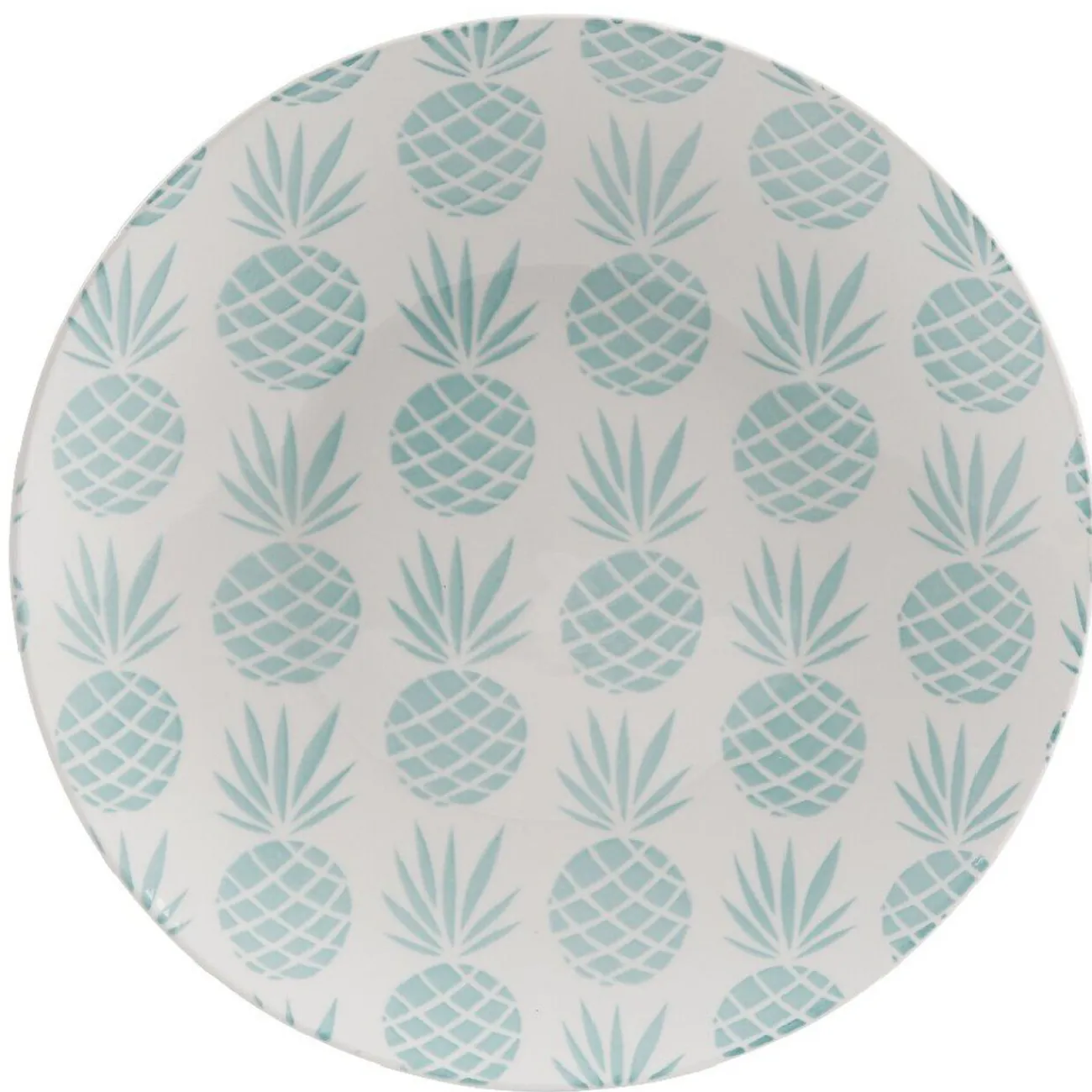 Assiette plate blanche en faïence de forme ronde avec motif ananas bleu clair. Découvrez sur notre site, l’assiette à dessert assortie !