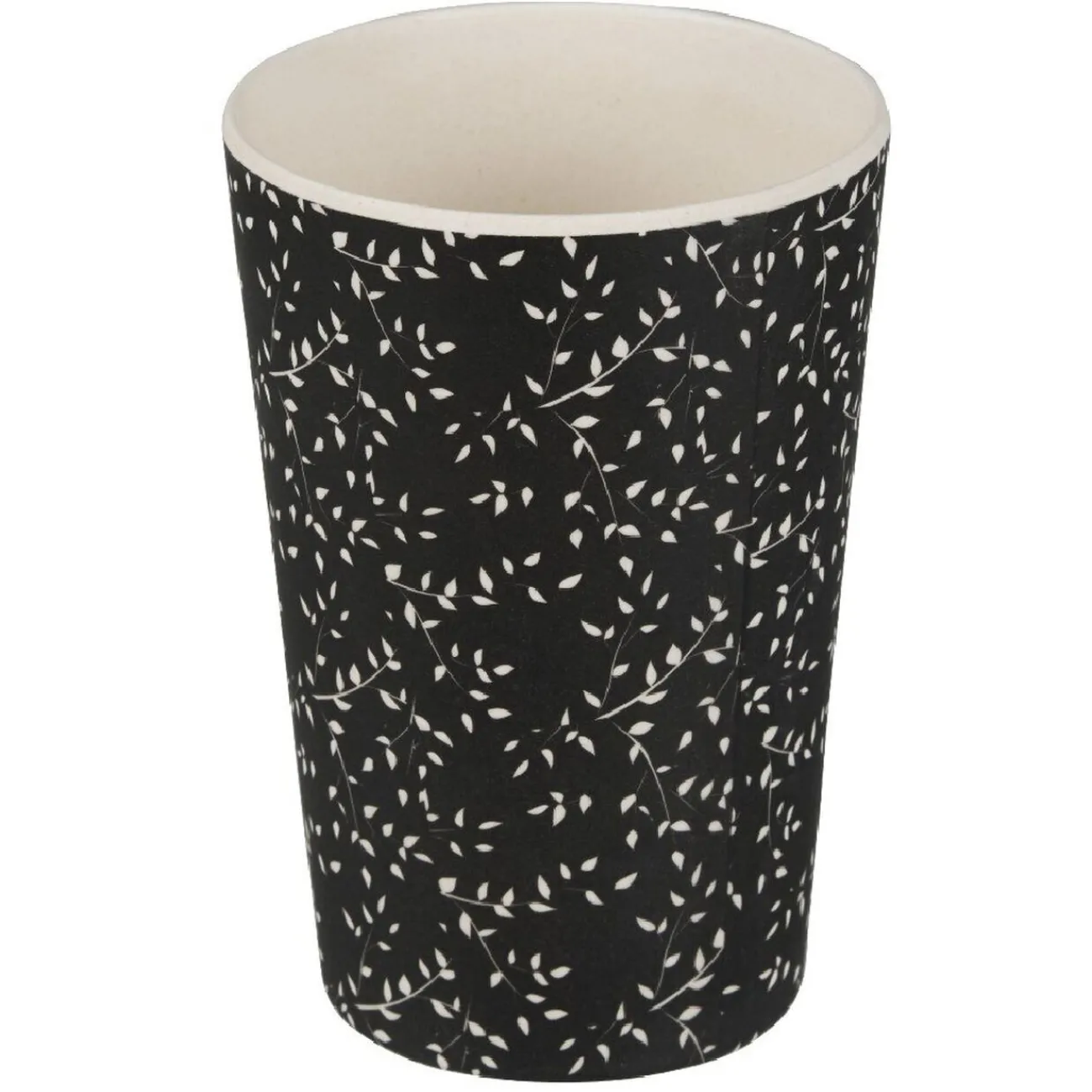 Gobelet en mélaminé noir à motif feuille blanche.