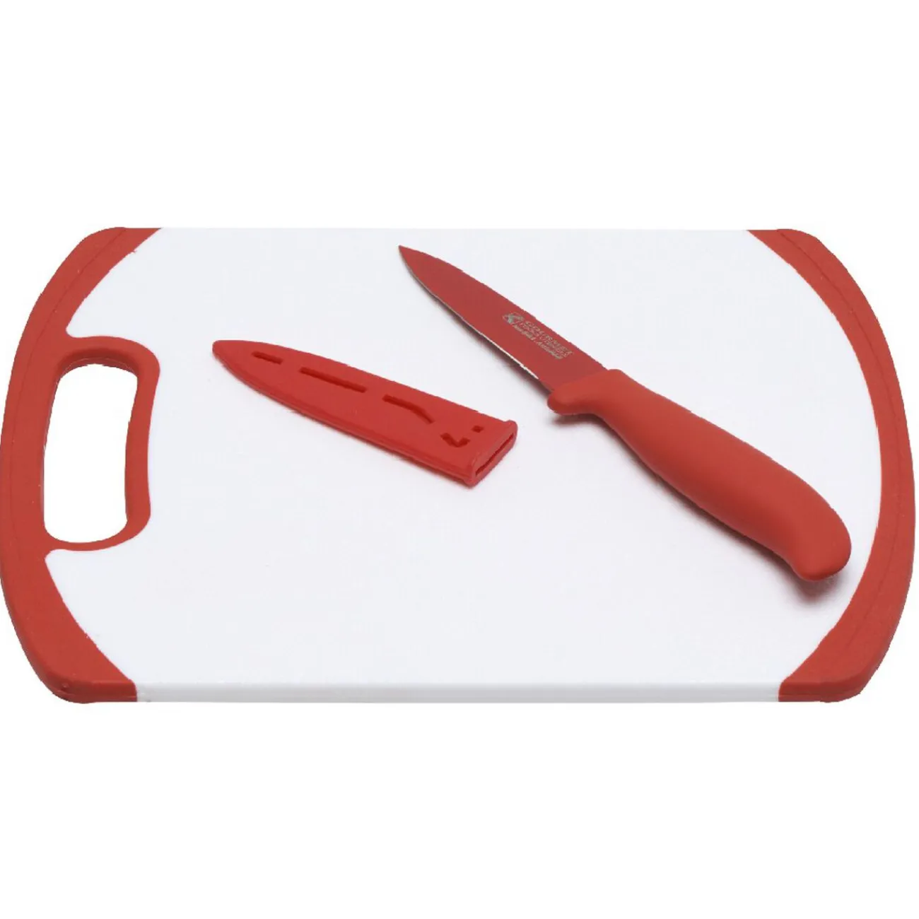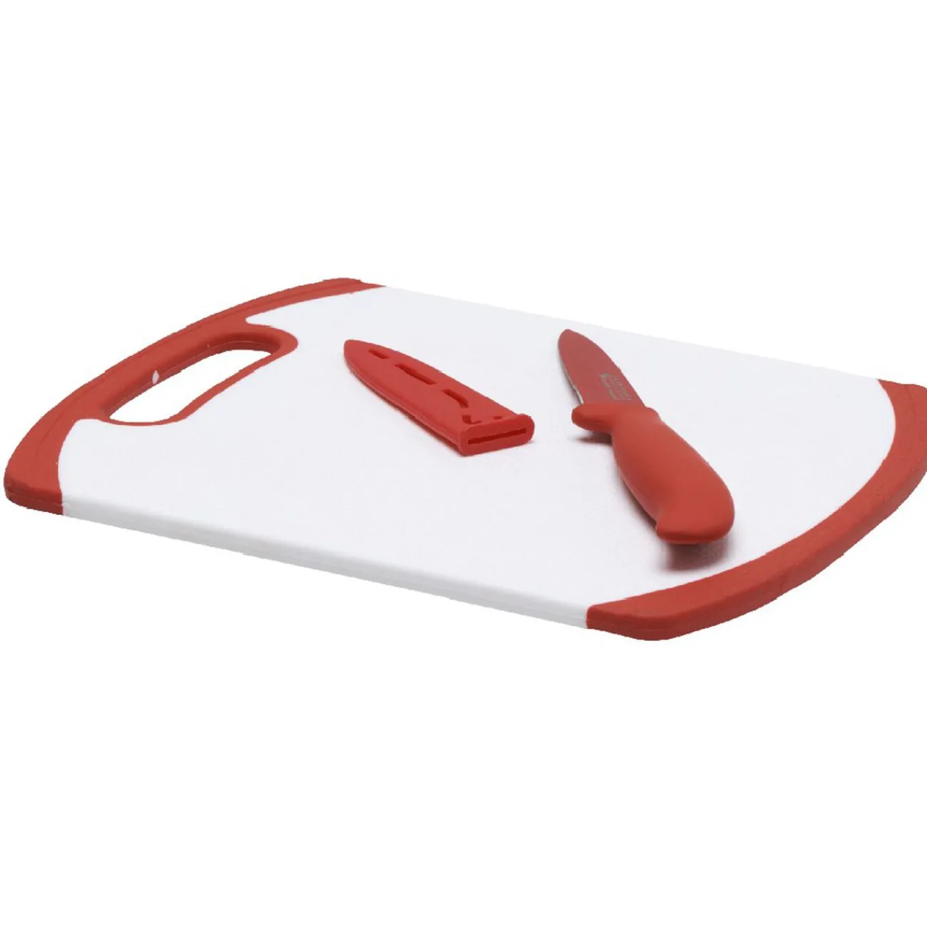 Planche à découper blanche et rouge et couteau rouge assorti avec revêtement anti-adhésif.