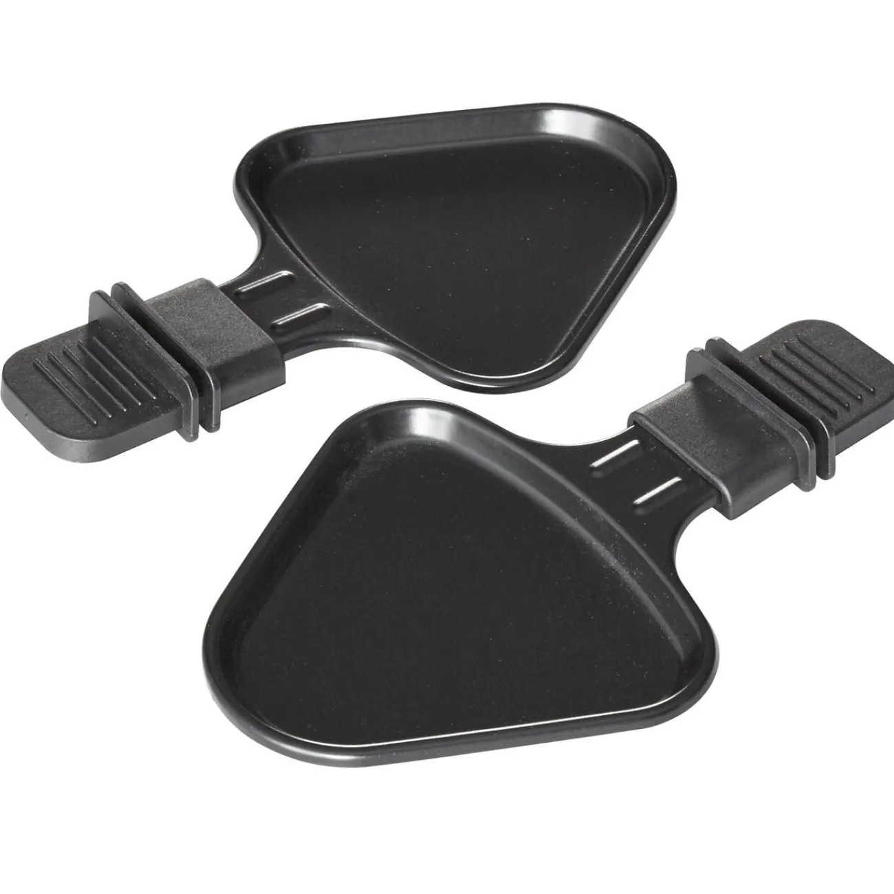 Set de deux coupelles à raclette de forme triangulaire en aluminium avec revêtement antiadhésif.