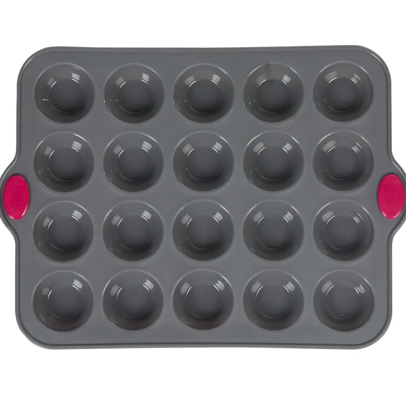Moule en silicone gris pour la cuisson de 20 petits-fours avec armature rigide en acier pour une meilleure stabilité et prise en main.
