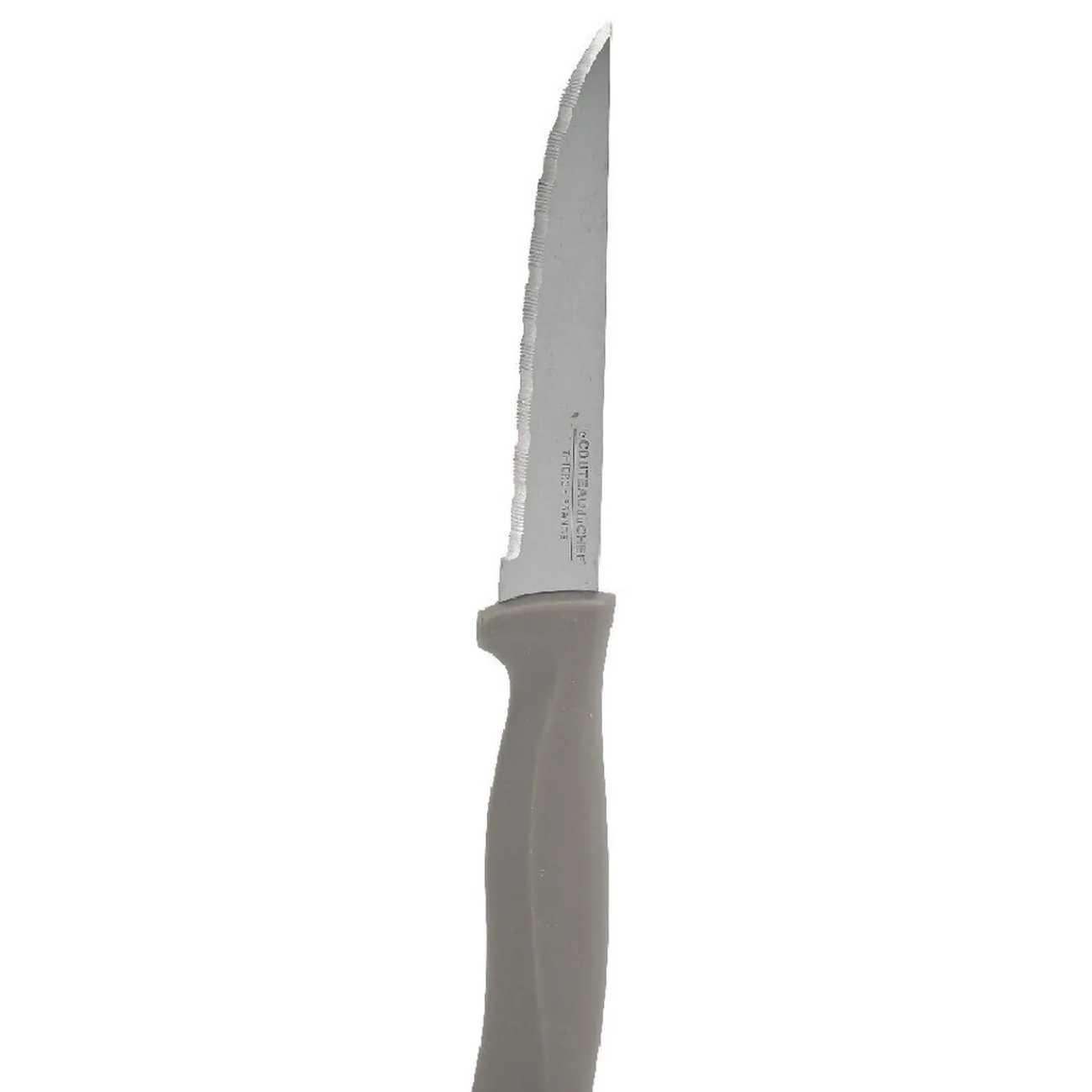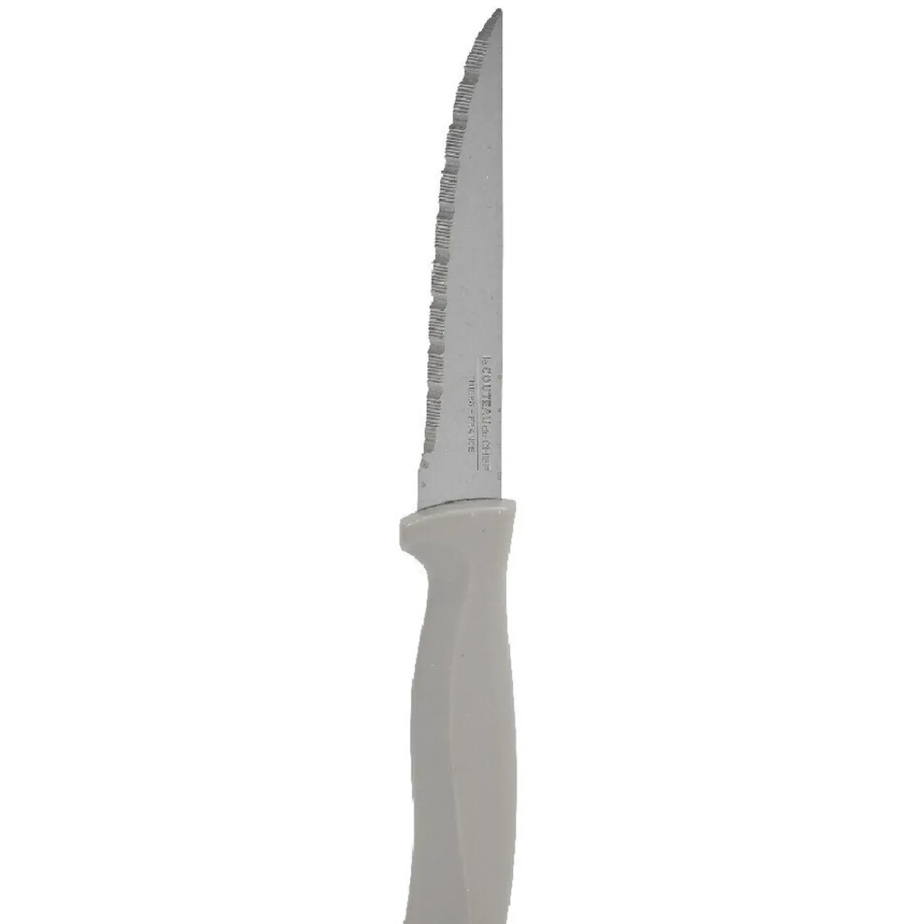 6 couteaux de cuisine en métal avec manche en plastique de couleur gris clair.
