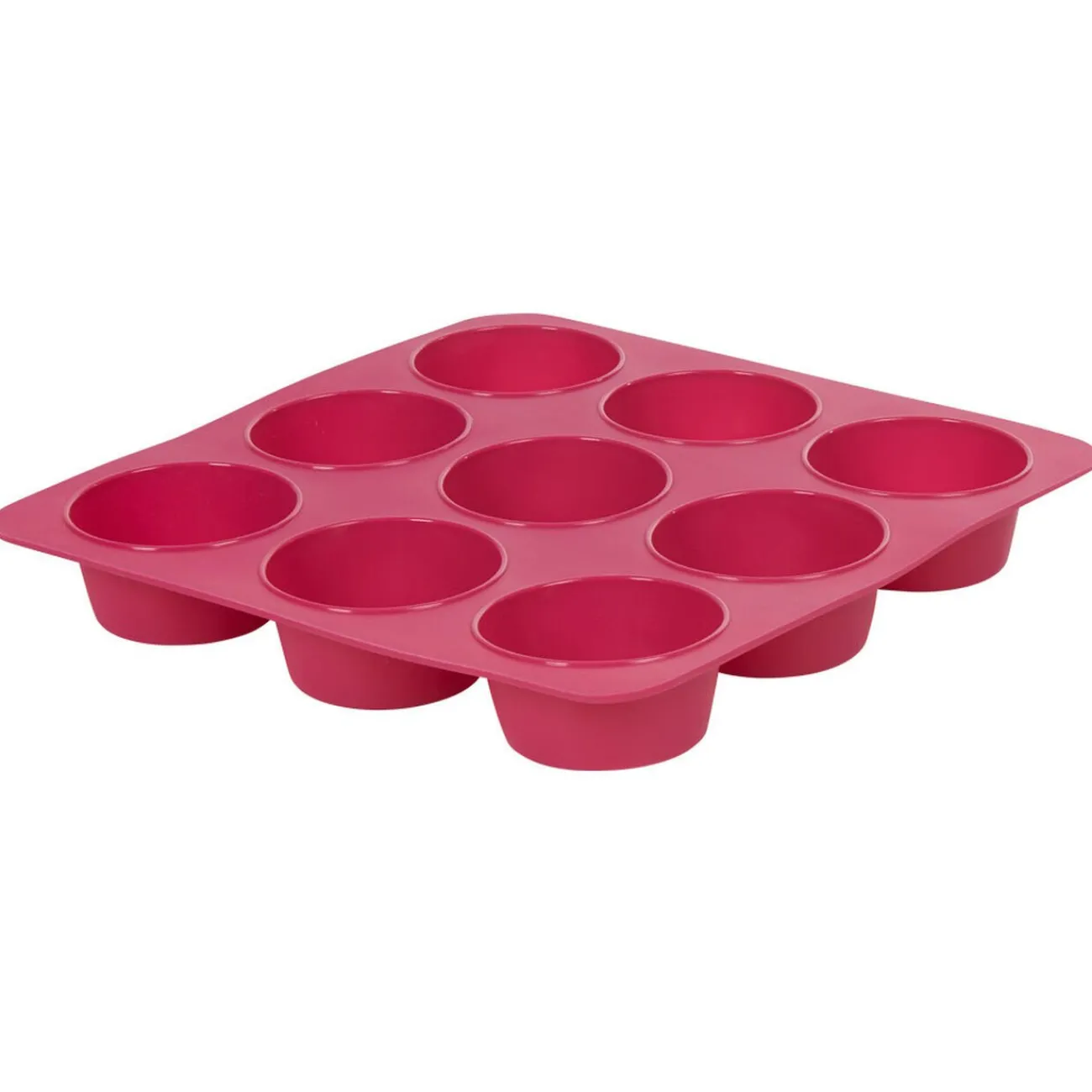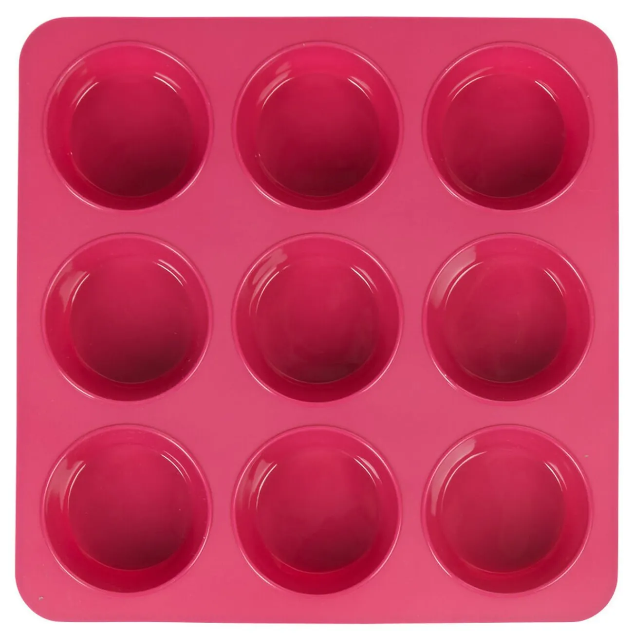 Moule carré en silicone de couleur rose pour la cuisson de 9 délicieux petits muffins.