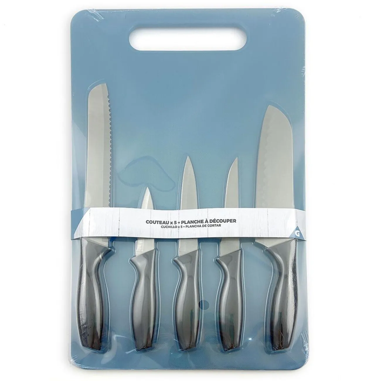 Soyez équipé pour couper tous vos aliments avec cette planche et ses 5 couteaux :