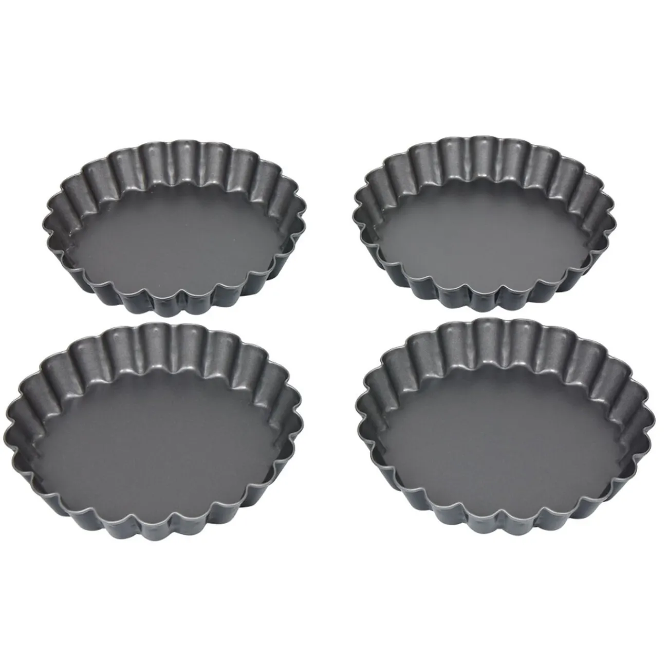 Lot de 4 moules à tartelettes de 12 cm de diamètre avec revêtement anti-adhésif, idéal pour un démoulage facile.