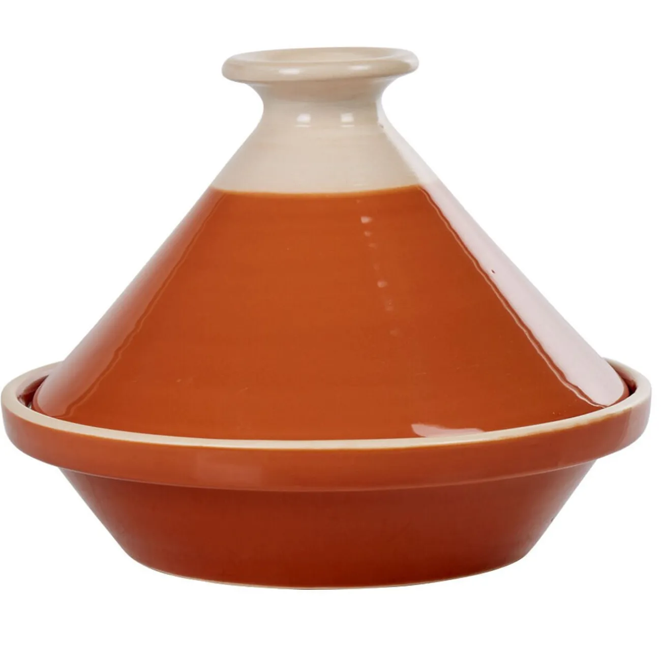 Plat à tajine en faïence rouge brique avec rebords blancs ivoire.