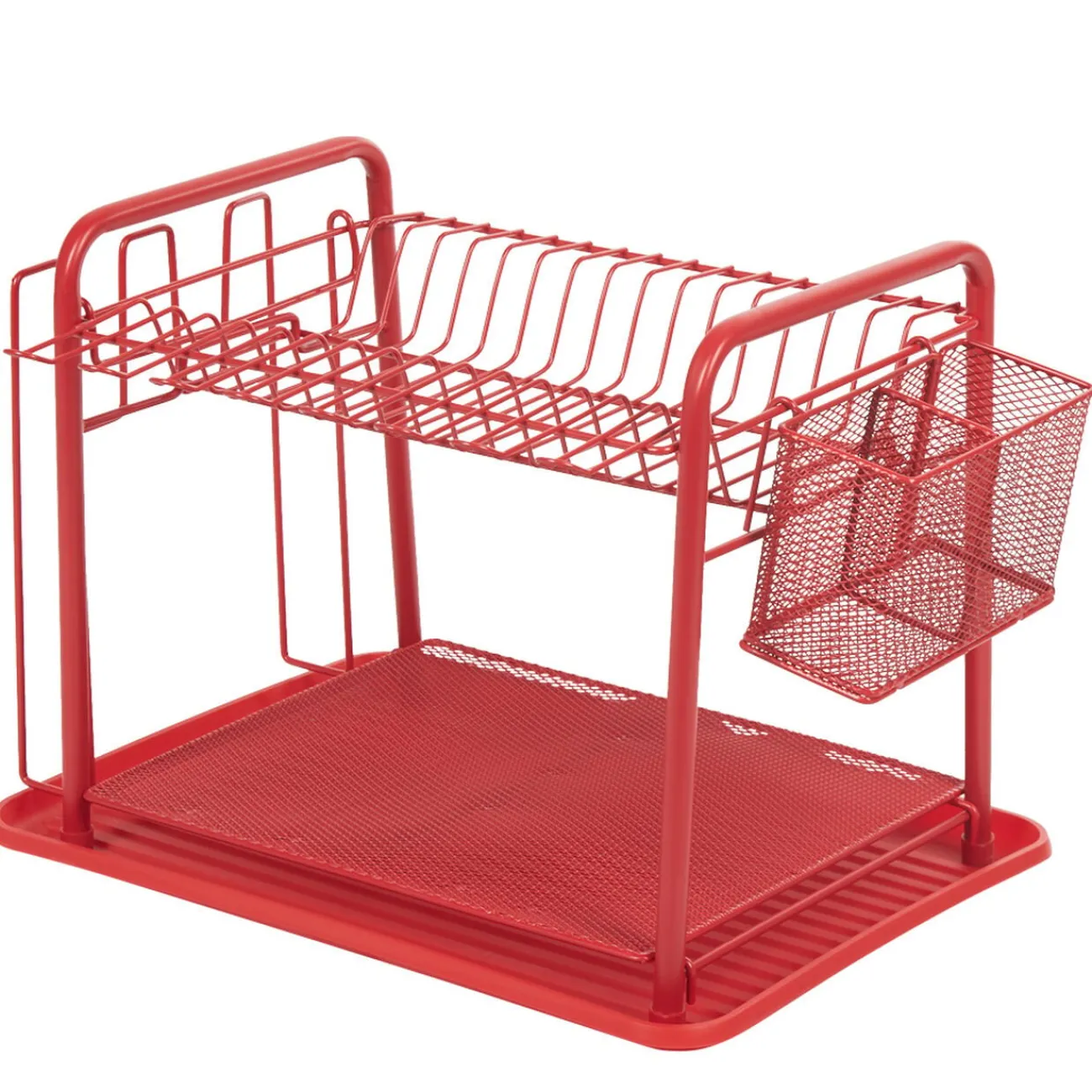 Egouttoir à vaisselle avec range-couverts en métal rouge.