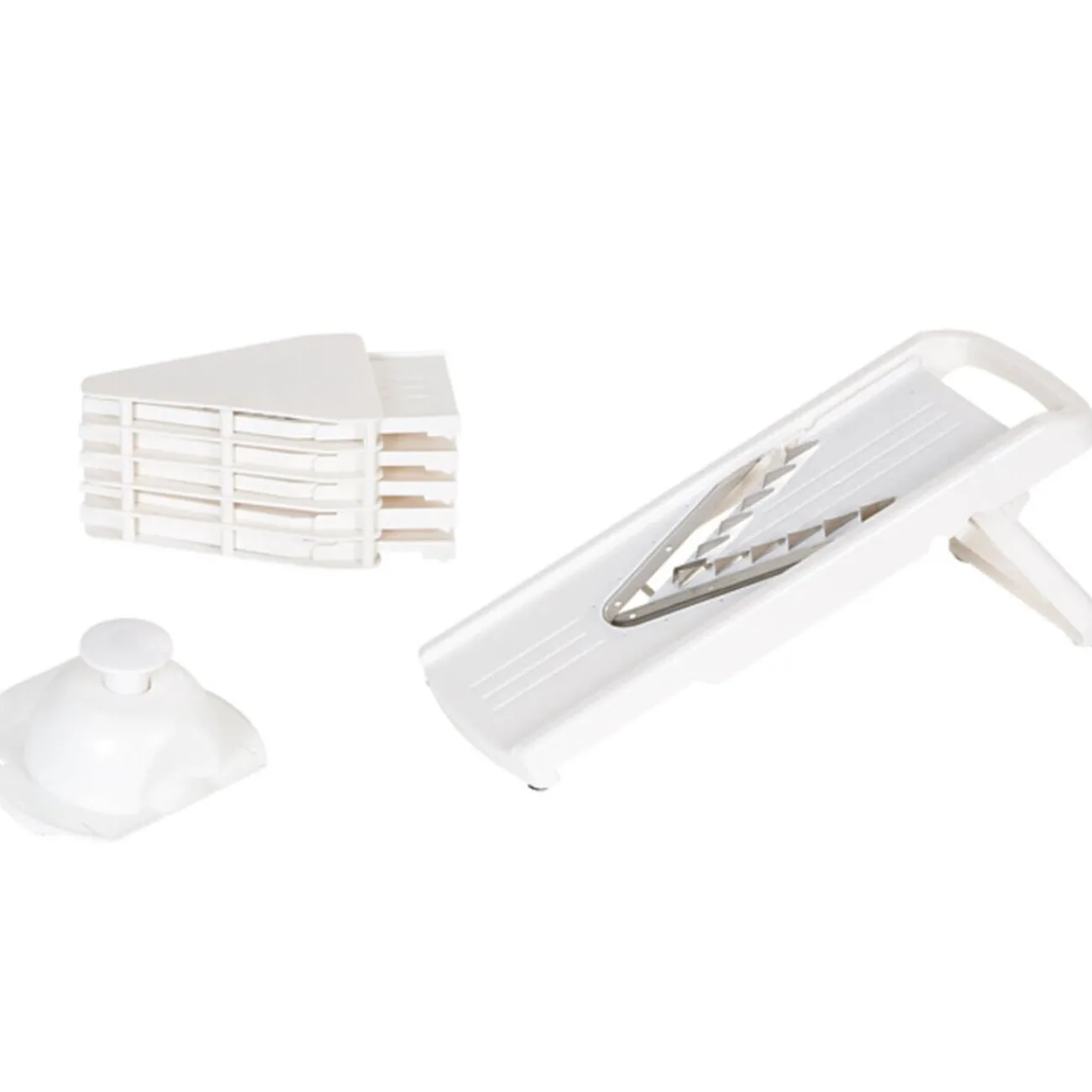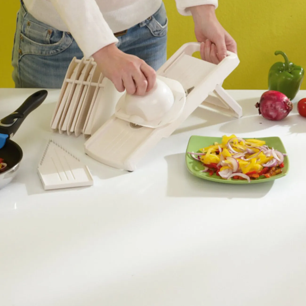 Mandoline 8 pièces, dim. 38,5×13 cm, plastique, contient 5 accessoires de découpe, 1 lame inox, 1 poussoir, 1 rangement. La mandoline coupe, tranche, émince et râpe tous les aliments.