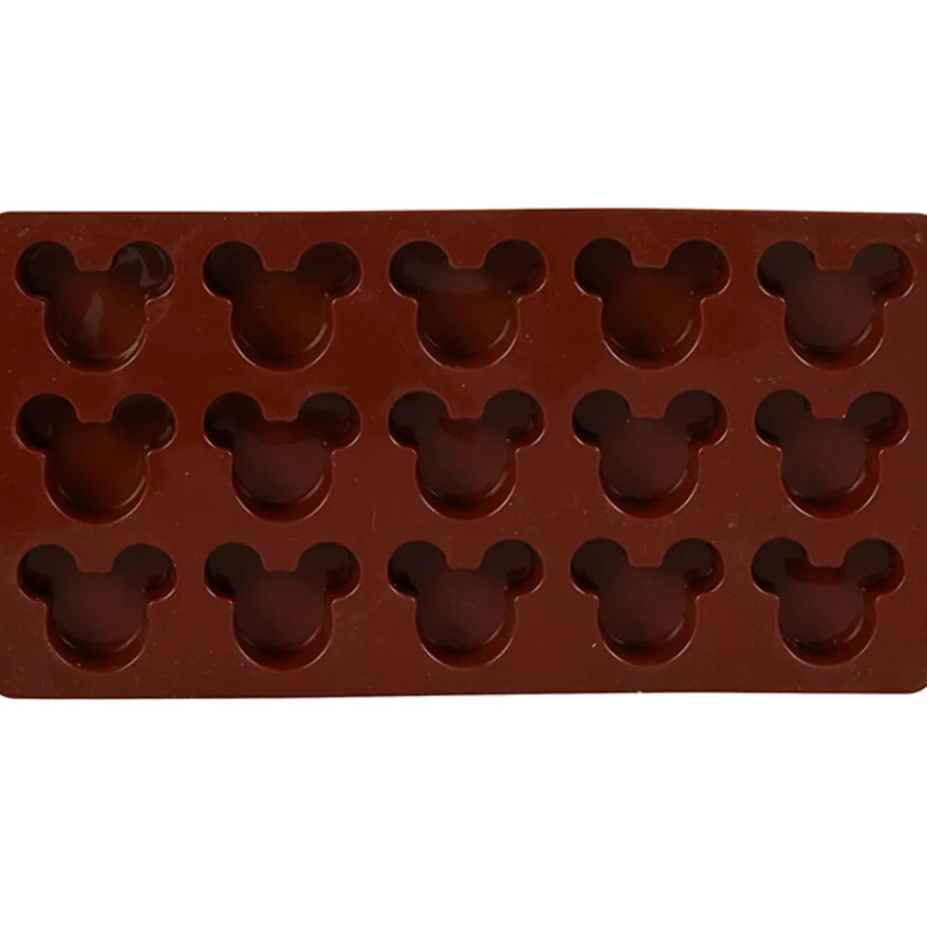 Moule pour 15 chocolats Mickey en silicone, plaque dim. 11,5×26,5×1,7 cm.