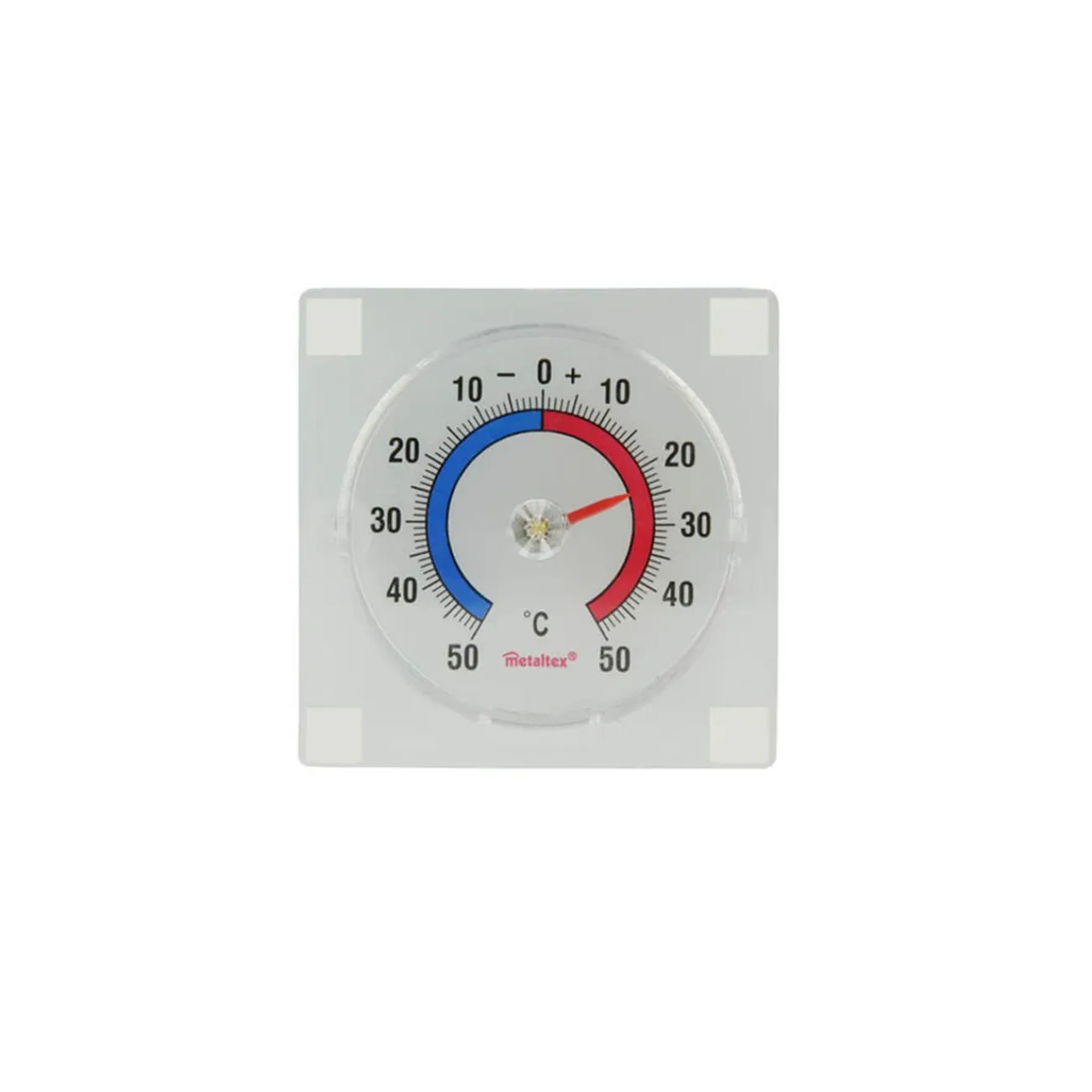 Thermomètre Metaltex d’extérieur. Adhésif, vous pourrez directement le fixer sur une fenêtre ou une porte vitrée et il vous indiquera la température jusqu’à -50°C et +50°C.