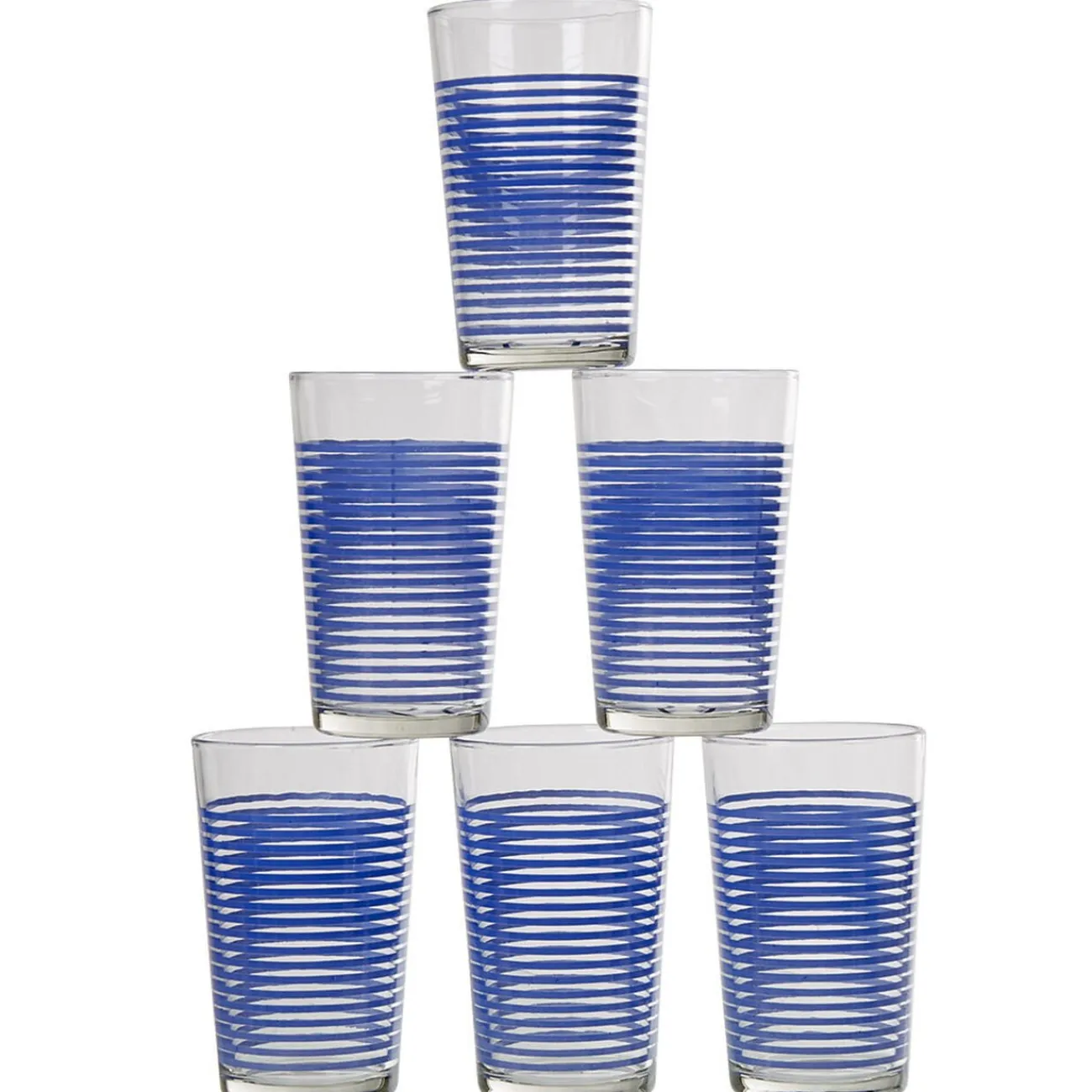 Lot de 6 verres avec rayures de couleurs assorties: 2x bleu, 2x jaune et 2x vert.
