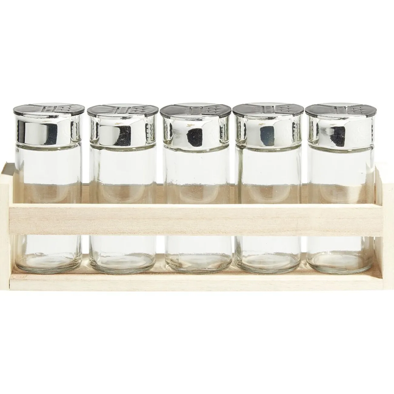 Support à épices en bois avec ses 5 pots en verre transparent.