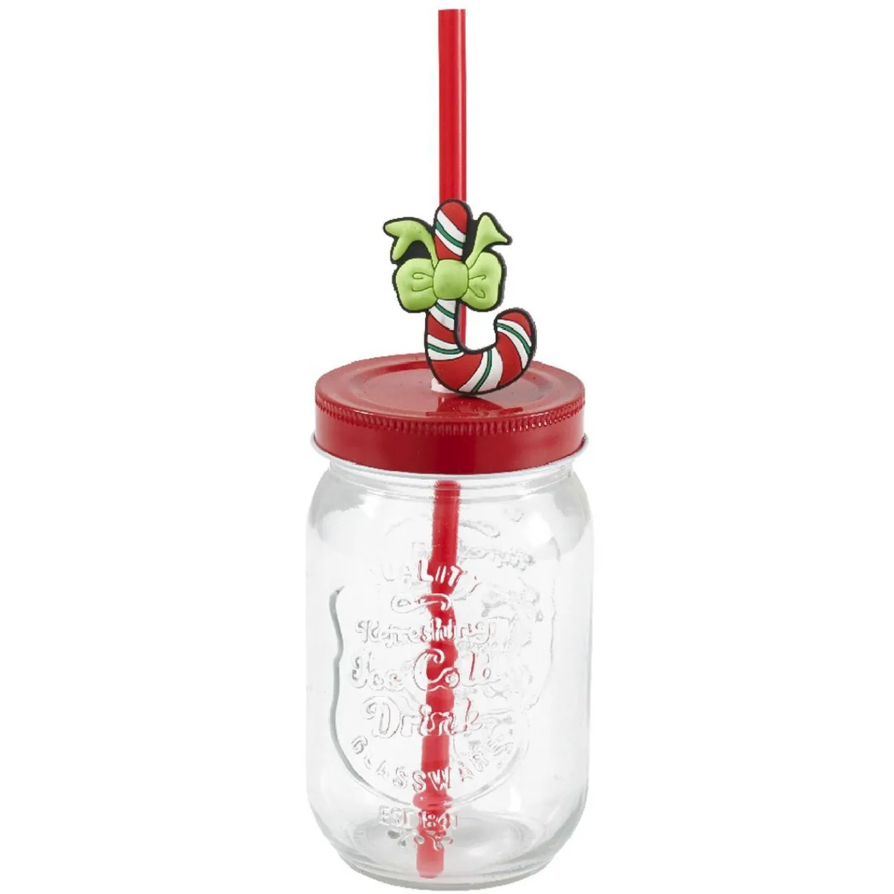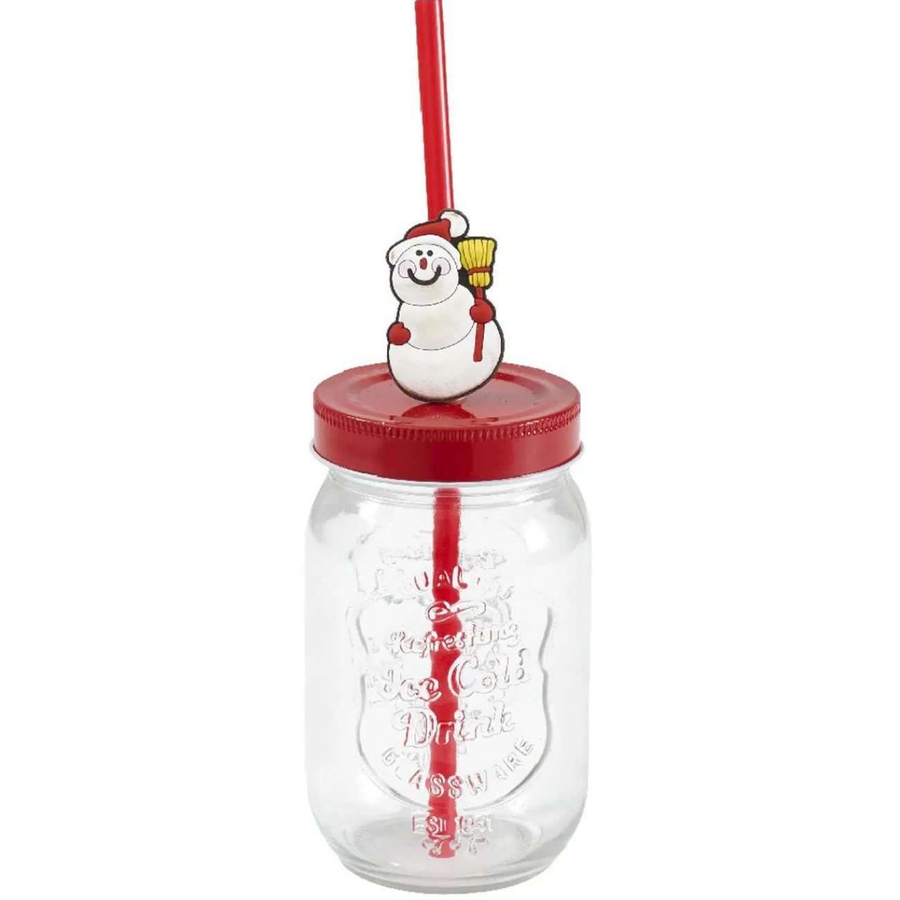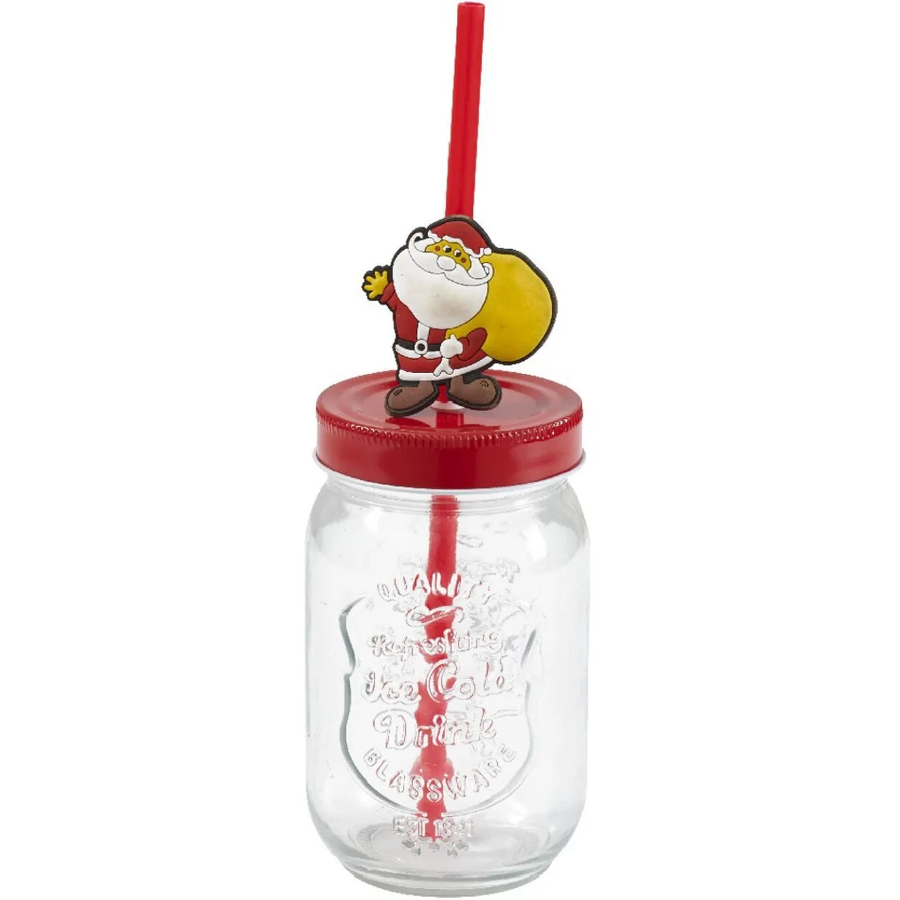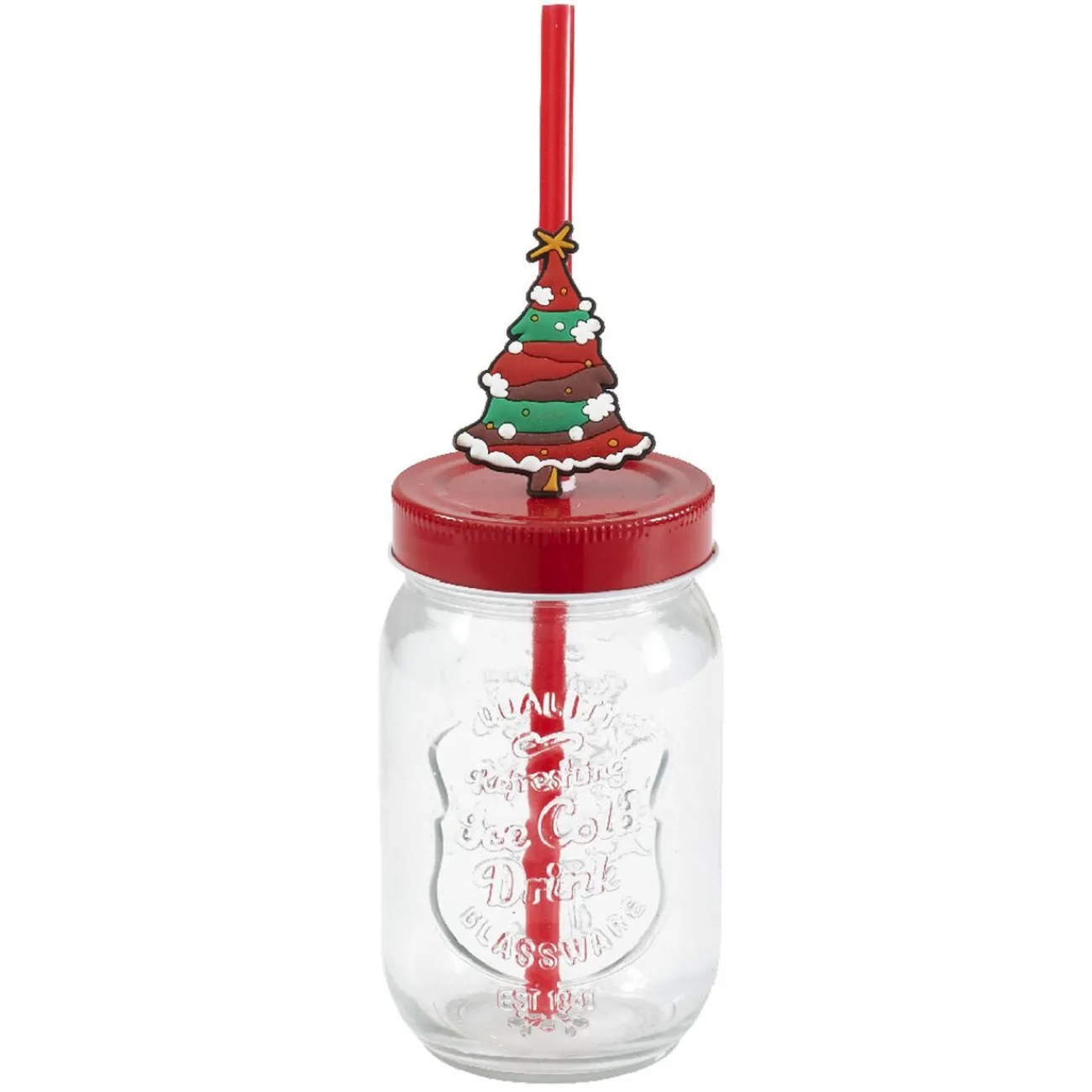 Panier rouge et doré en bois avec inscription « Merry Christmas » et ses 4 emplacements prévus pour recevoir les 4 gobelets inclus avec une paille chacun décorée par une forme de Noël : sapin, Père Noël, sucre d’orge et bonhomme de neige.