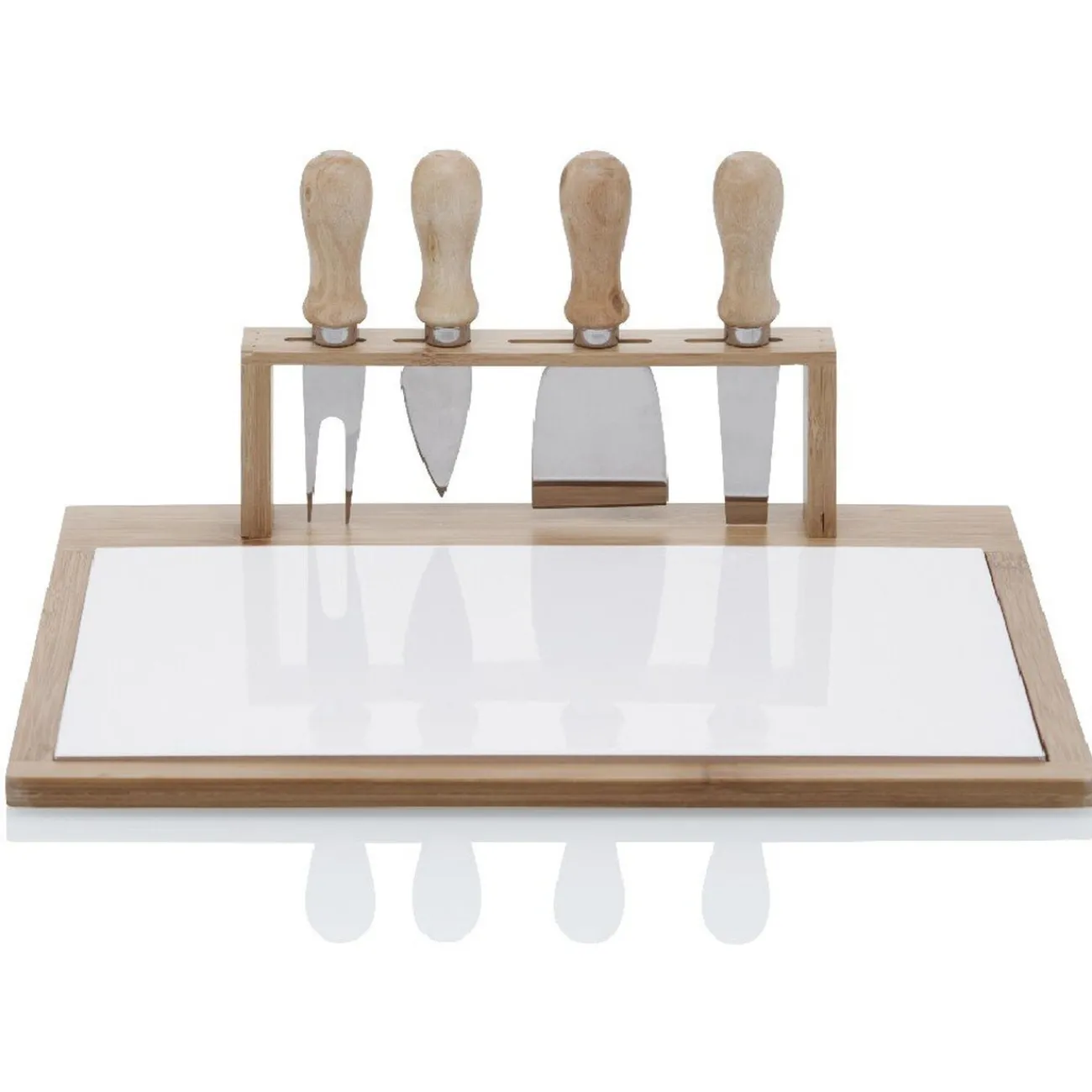 Plateau avec 4 couteaux à fromage intégrès, pratique pour le service du fromage en toute convivialité.