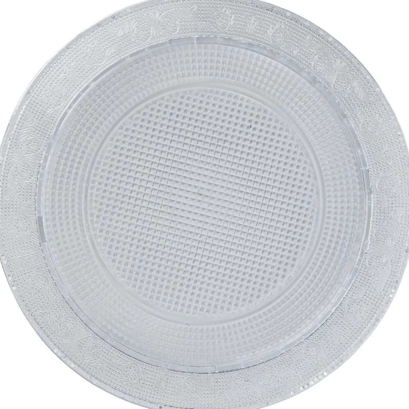 Plateau rond transparent au design luxueux.