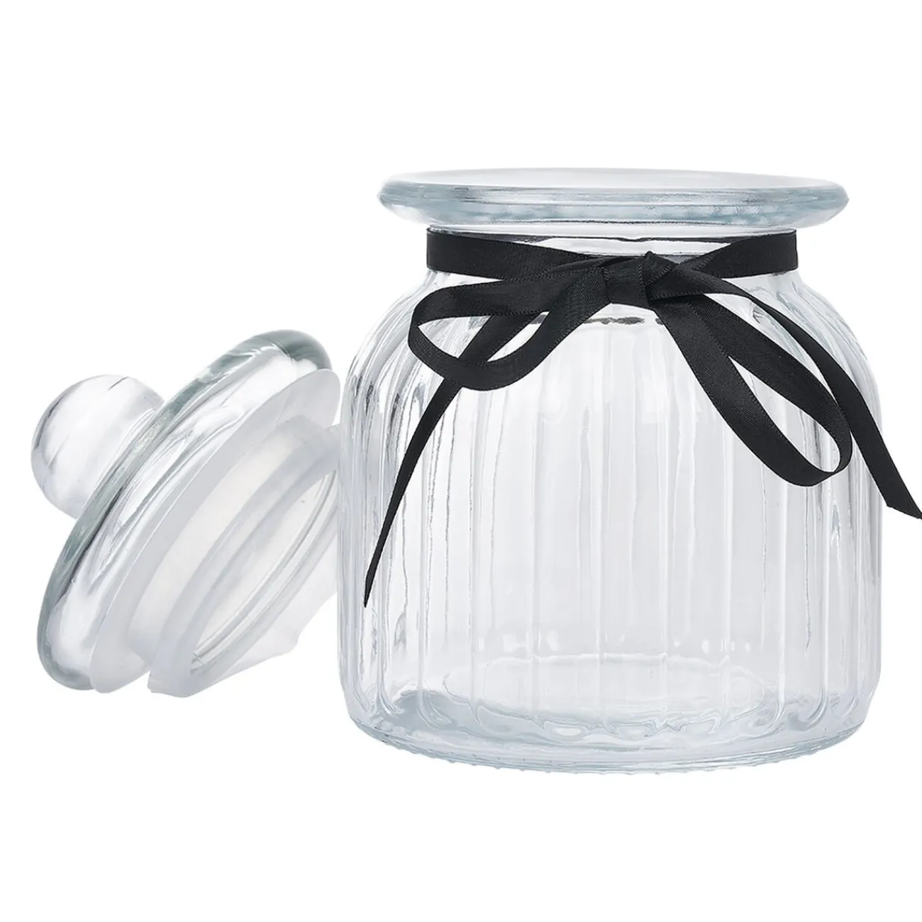 Superbe bonbonnière en verre au décor embossé et son couvercle hermétique pour stocker confiserie, fruits secs, biscuits et autres aliments sur les étagères.