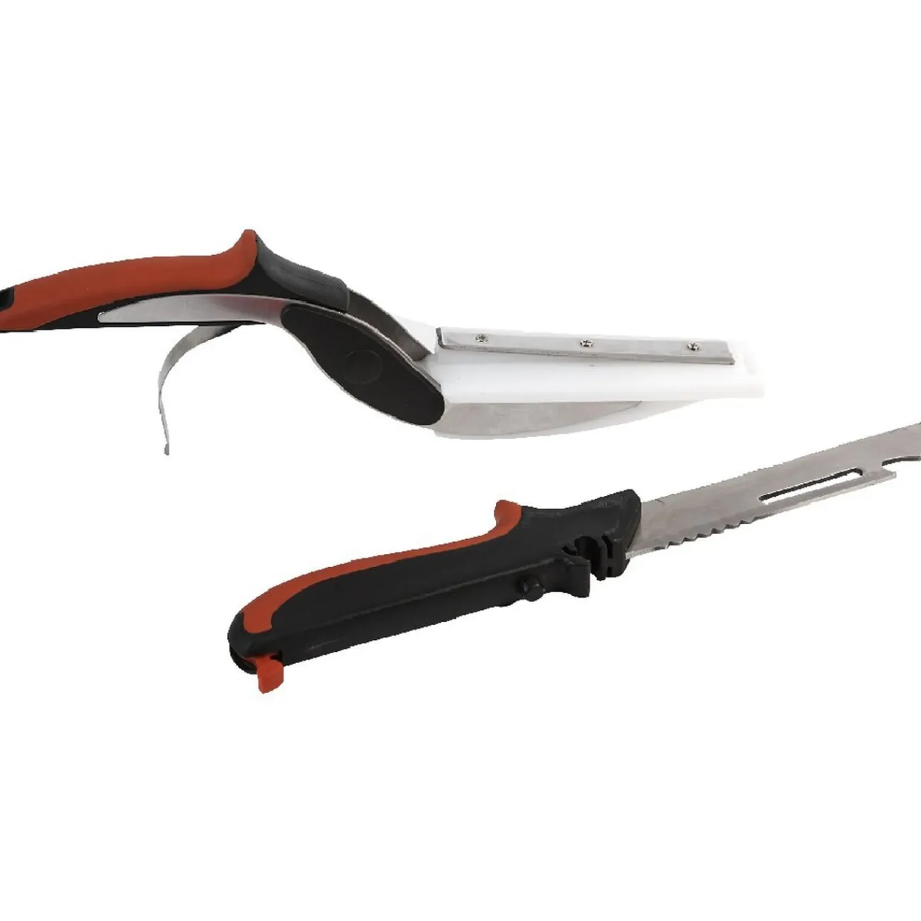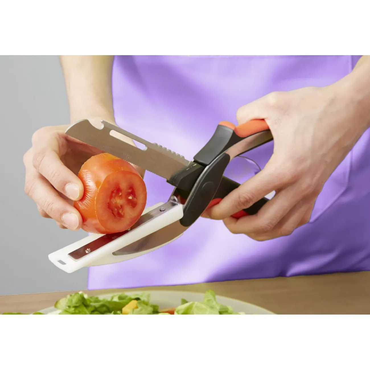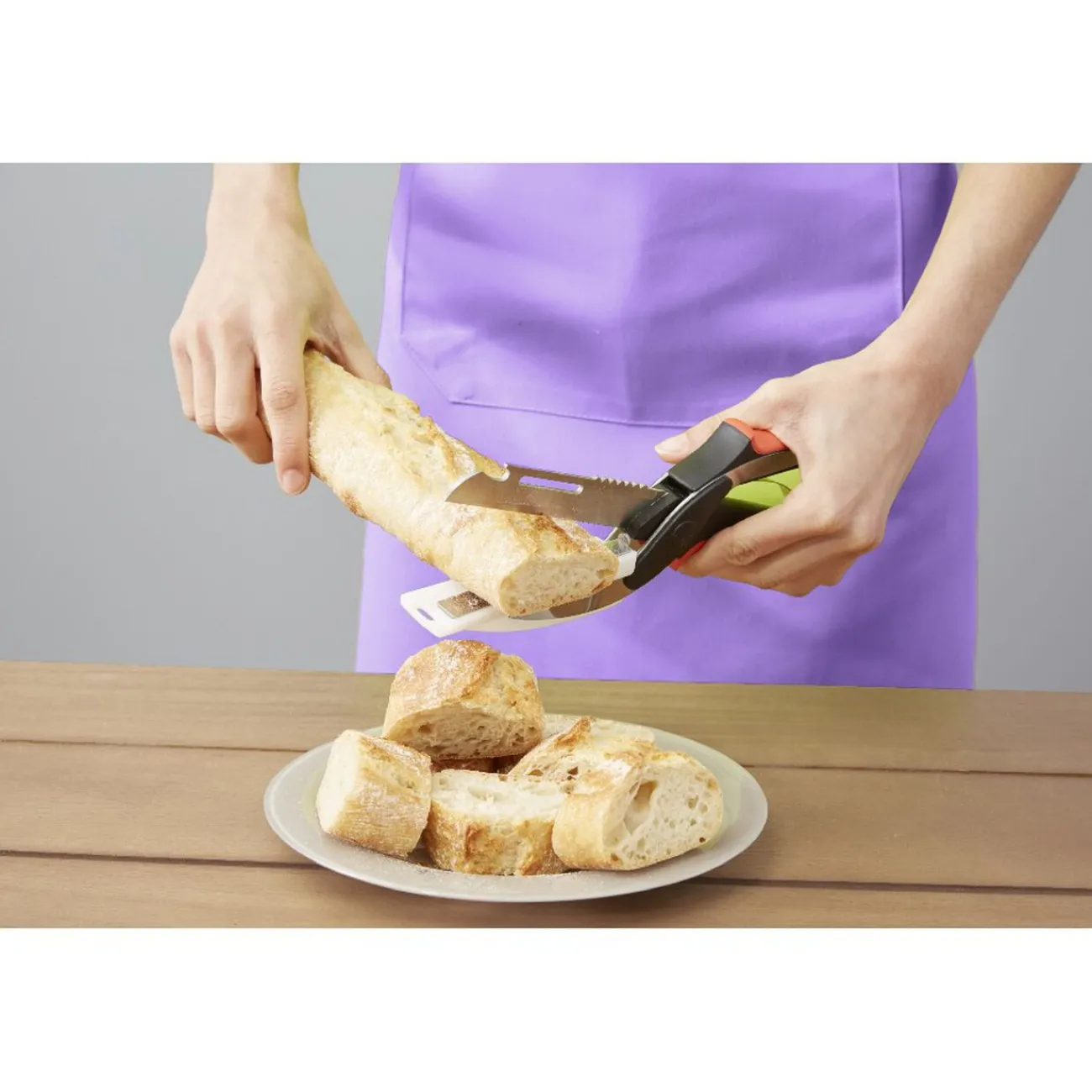 Ciseaux de cuisine multifonctions avec couteau et planche intégrès, ils coupent tout: aliments durs, pain, fruits et légumes en quelques secondes !