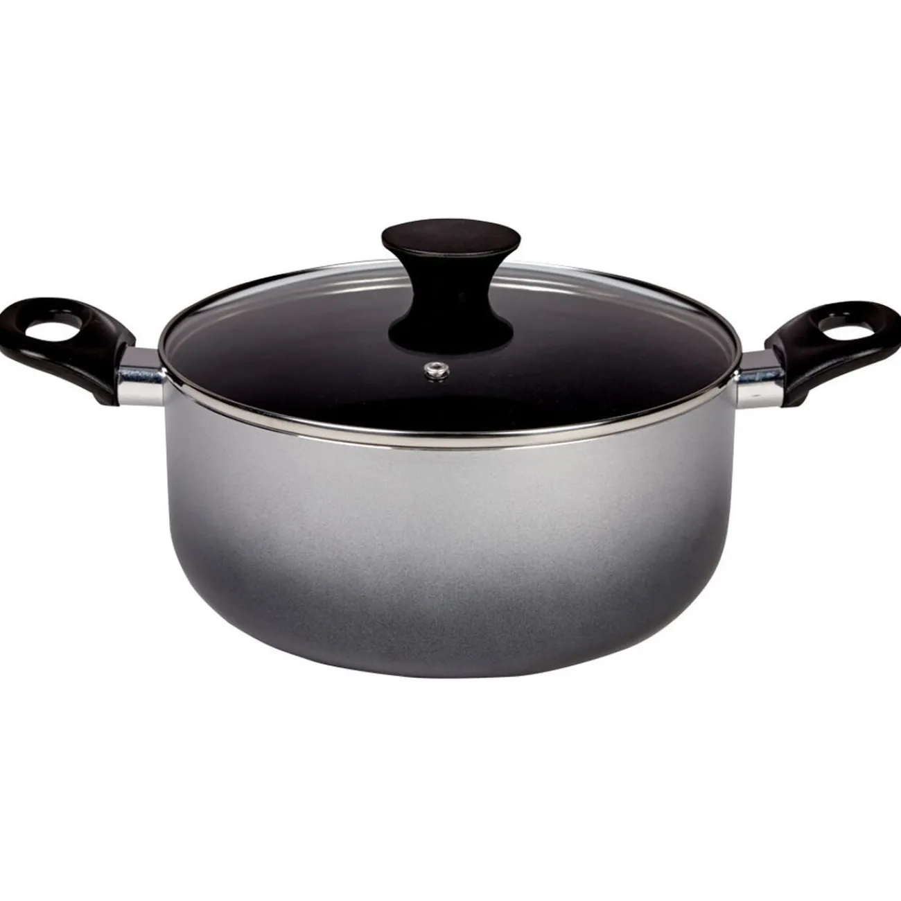 Marmite en aluminium de couleur grise avec poignées en plastique noir.
