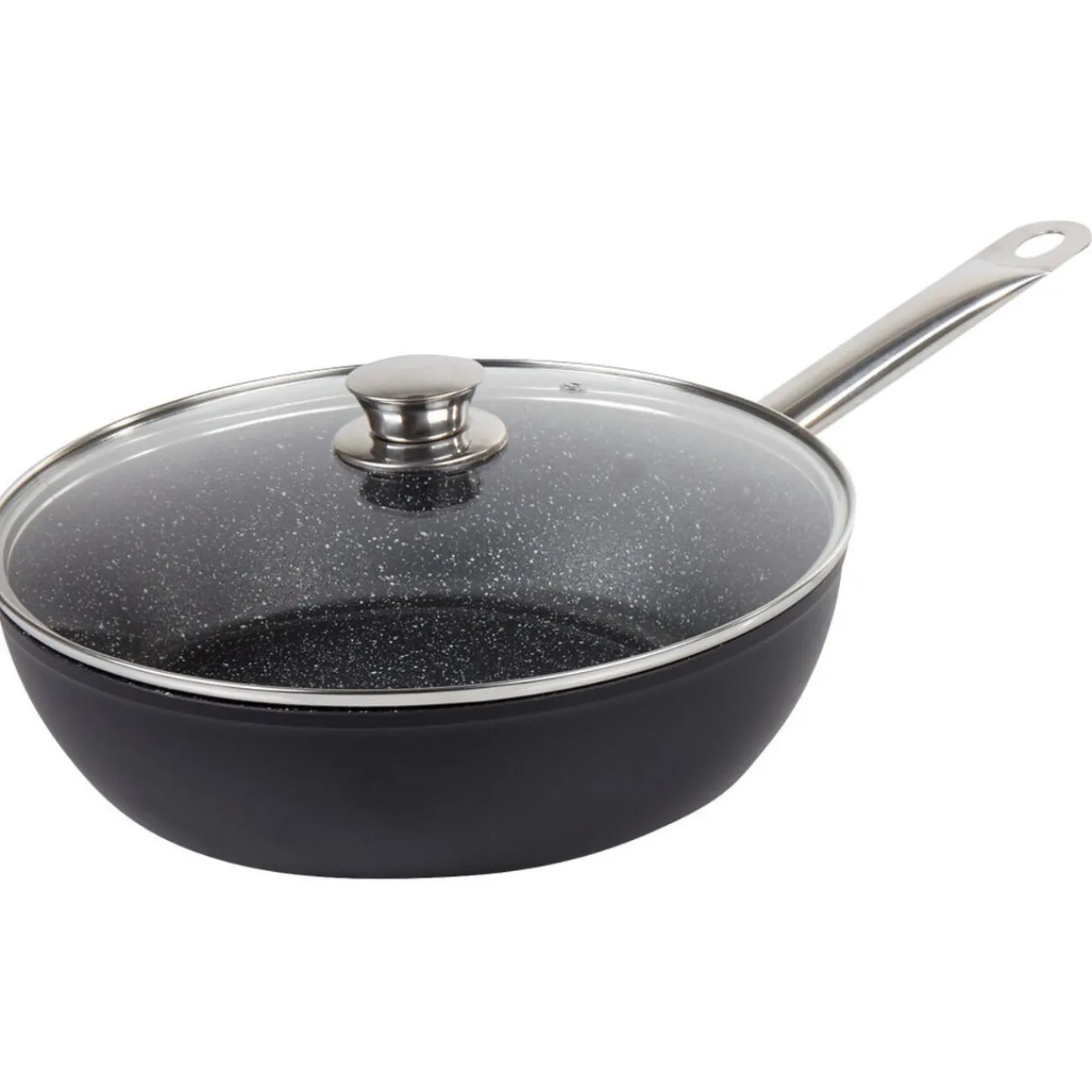 Sauteuse effet pierre en aluminium forgé, couvercle en verre et manche en acier inoxydable, ø 28 cm, revêtement fond grainé, antiadhérent.