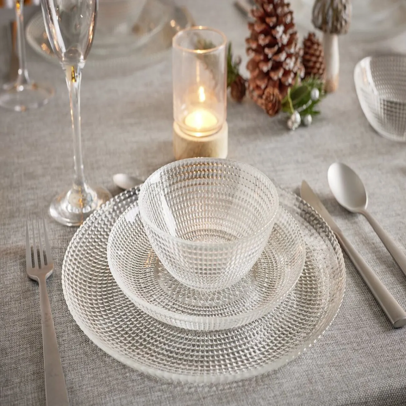 Sortez de la belle vaisselle pour vos invités ce soir. Ce splendide service en verre apportera une touche d’élégance supplémentaire à votre décoration de table grâce à sa transparence et son relief au toucher.