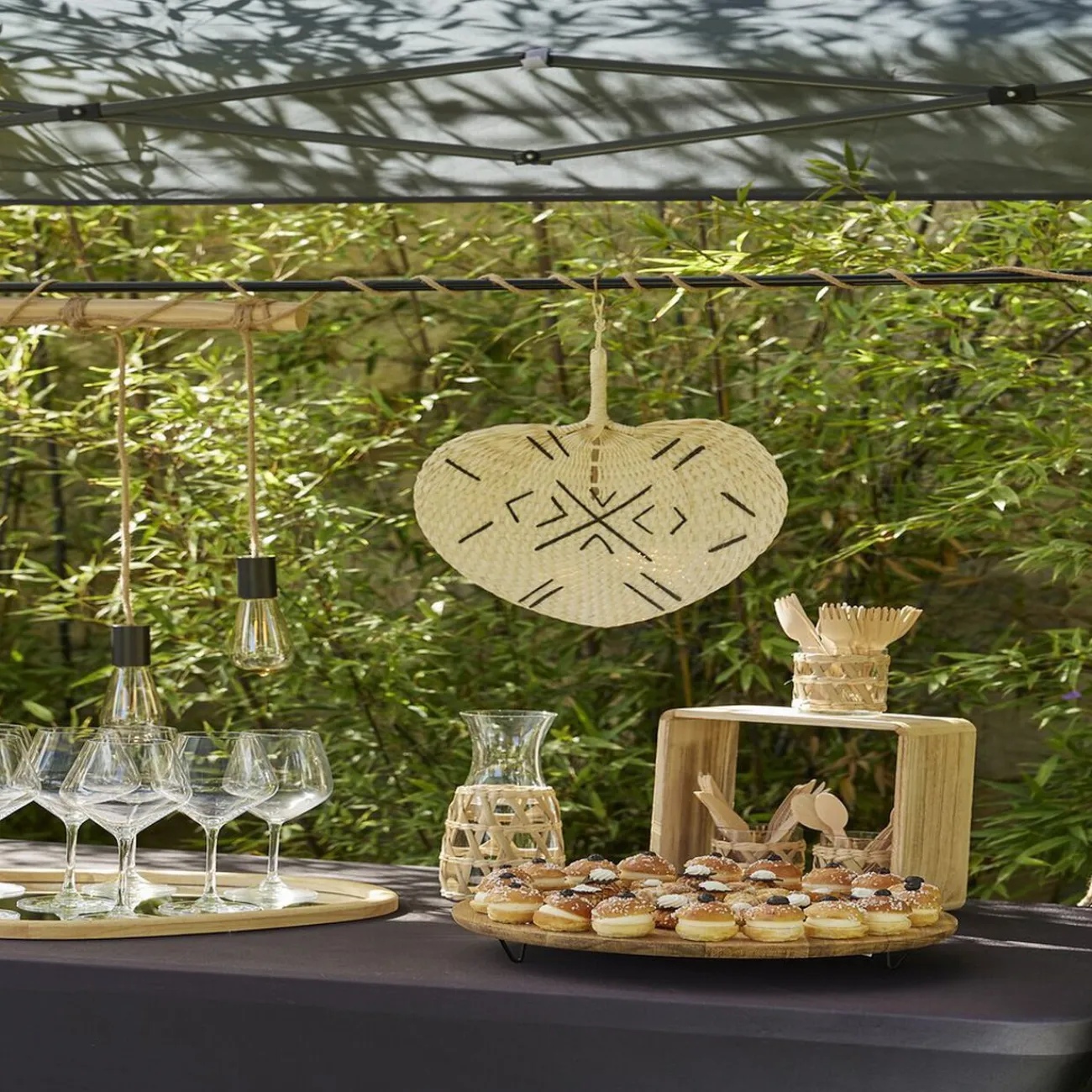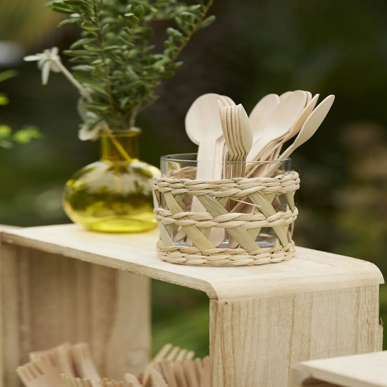 Ce verre transparent accompagné d’une finition en raphia naturel, offre des dimensions de 8 cm de diamètre et 12,5 cm de hauteur.