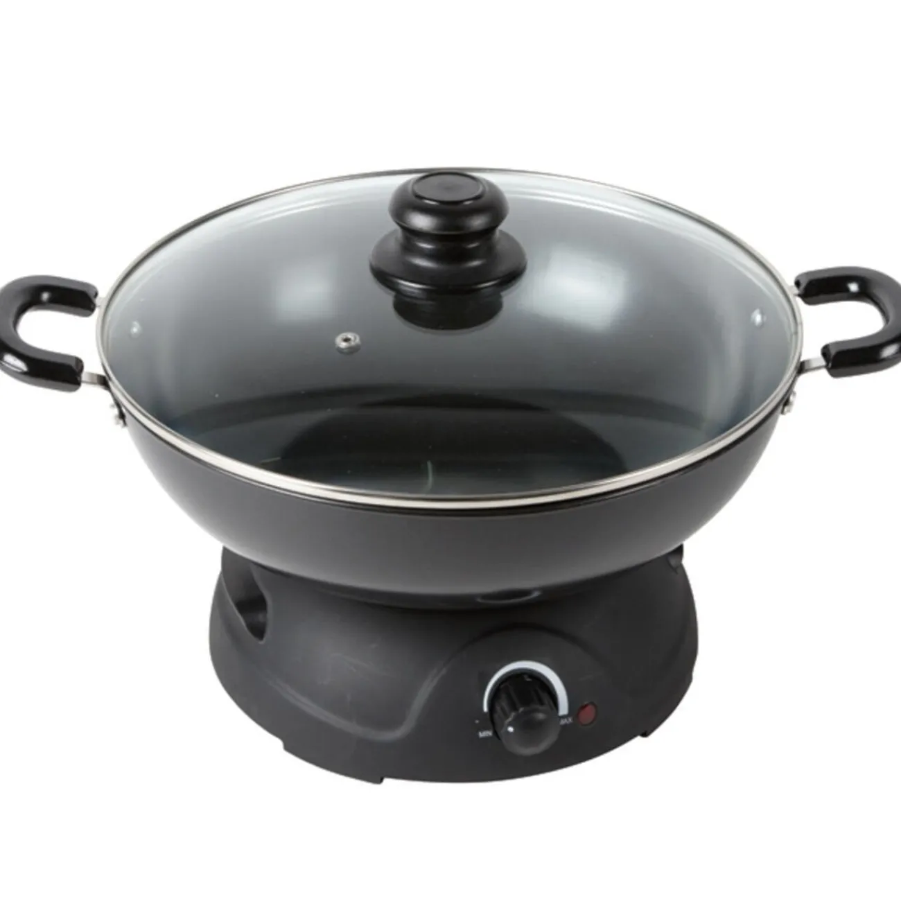 Wok électrique 1300 W, ø 31 cm, métal. Grille, spatule, couvercle en verre, revêtement anti adhérent, thermostat réglable..